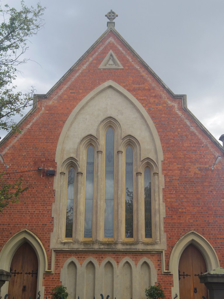 The completed church in Pleasant Street is slate-roofed and of five bays divided by unusually elaborate buttresses with triple coping. The style is Early English Gothic, with a touch of Tudor in the notches on the front and rear gables. The façade is imposing for a church of its size, with a group of five handsome lancet windows set in a freestone panel. The quintuple theme is repeated in the five blind arches beneath the window. The arches and lower part of the lancets so fill the lower part of the façade that the entrance doors seem a bit cramped beside them. The flanking buttresses presumably terminated in pinnacles, since removed. A triangular oculus below the summit of the gable records the year of construction.