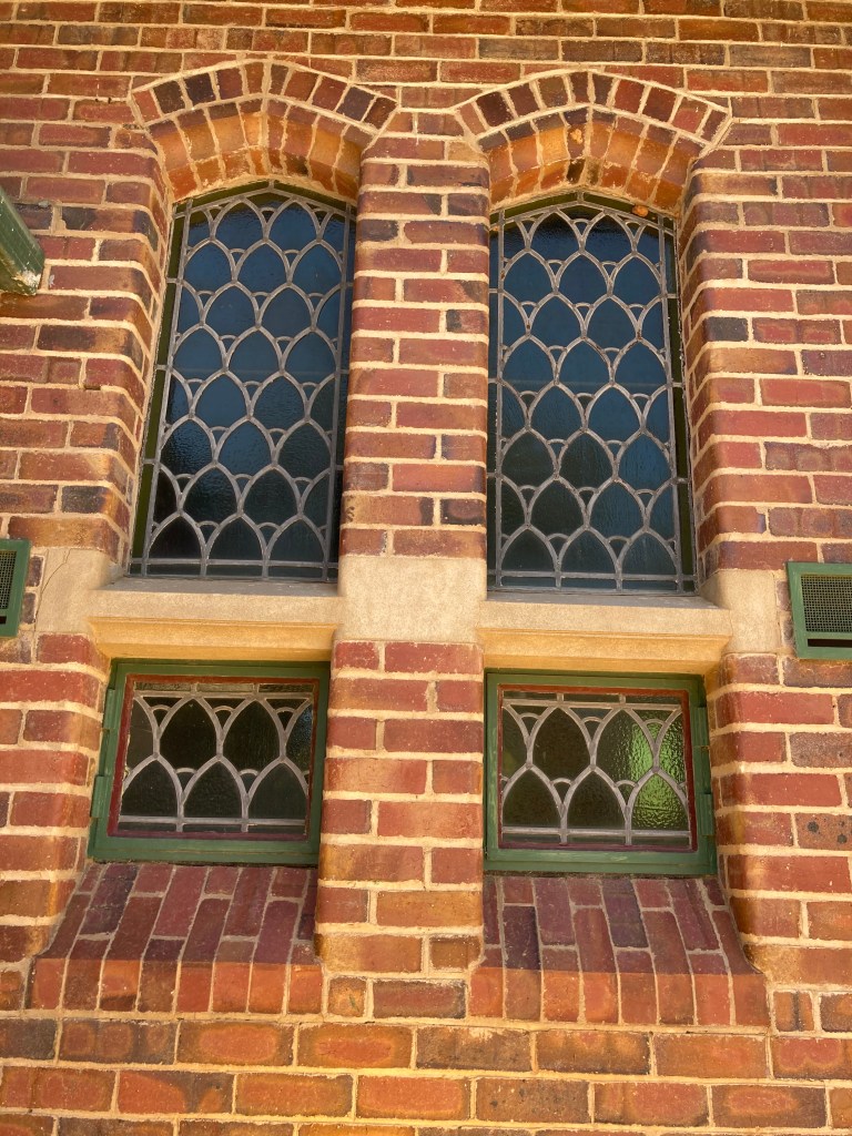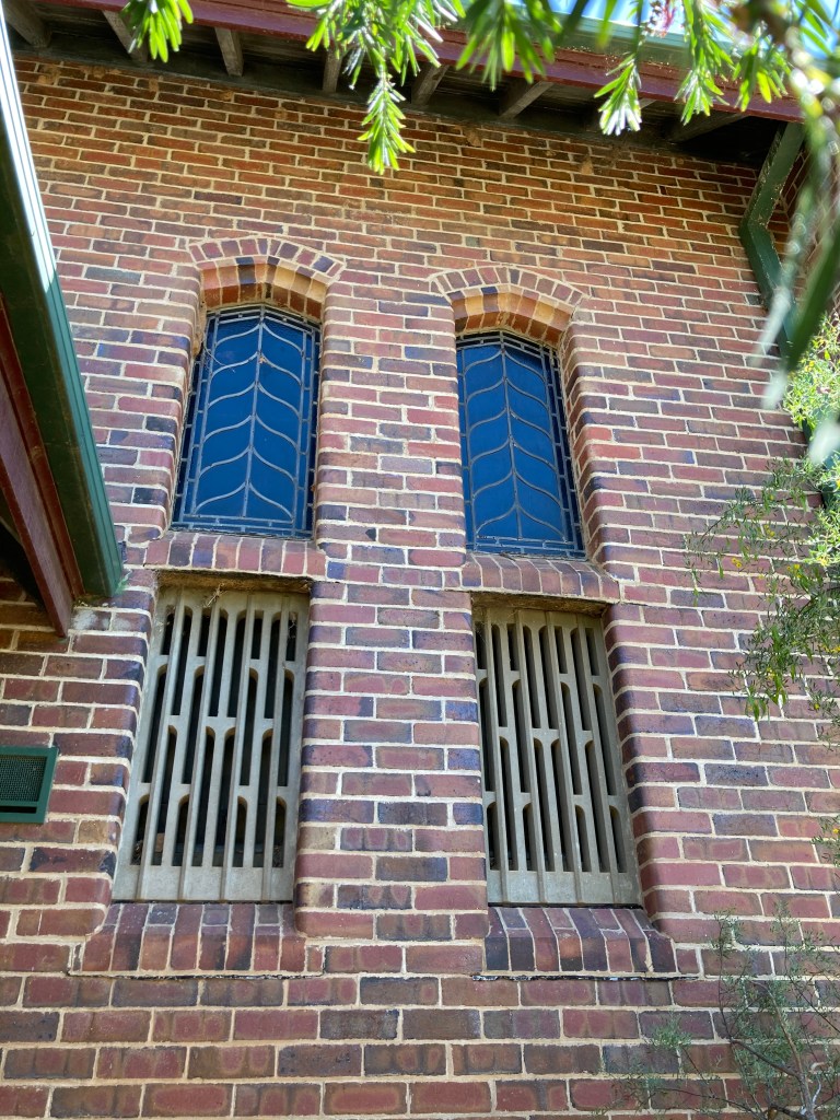 The windows are characteristic of Williams. The chancel is lit by, along with the rose window, paired lateral windows with glass in the upper openings and decorative metal grilles in the lower. The apsidal baptistery has single windows with segmental heads high up on each plane. The nave windows are Tudor-arched and divided by concrete transoms so that the lower panes open for ventilation. The leading in the windows, a geometrical pattern of pointed arches, was designed by the architect, whose attention to detail is apparent throughout the church. The hand-beaten metal door handles are worth noting in this regard.